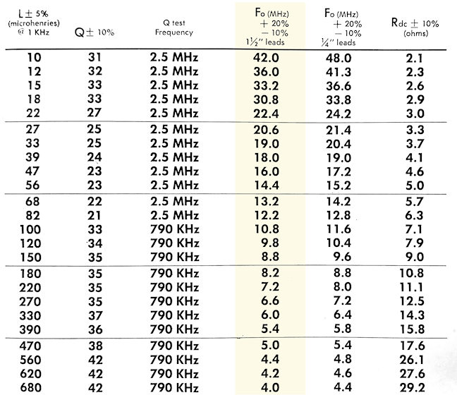 Coilcraft PF Series Type V ("Five")  Fixed Radial Inductor.  Universal wound on substrate and conformally coated with a durable, moisture resistant coating. These inductors are most commonly found in TV and radio applications, for video peaking, shunt and series filtering, and L-C tank applications.  Color coded for value, with generous 1.5" long leads on 0.3"  spacing.  Specifications for 10-680uH here.
