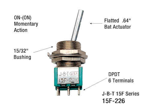J-B-T 15F-226 DPDT Miniature Toggle Switch ON-(ON), 2 Positions, one maintained, one momentary. 3A, 125VAC